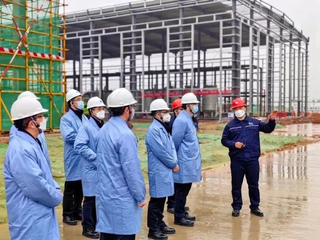 ▲在項目建設現(xiàn)場,了解新建電解液項目新工藝和總體進度
