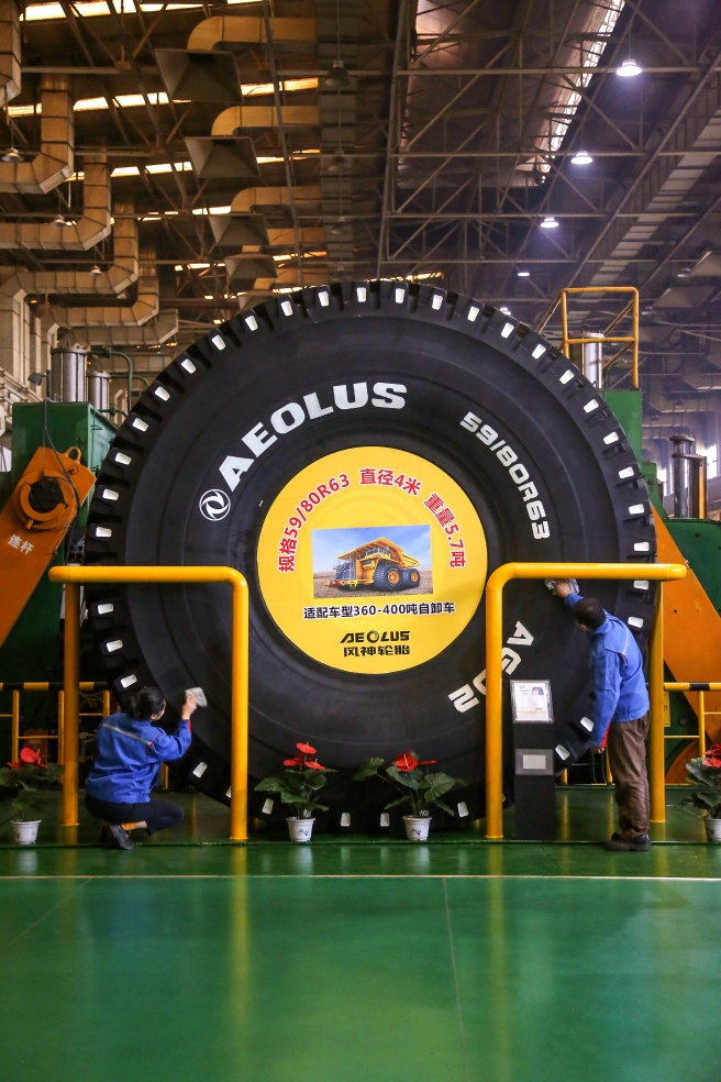 此次成功下線的巨型輪胎由風(fēng)神輪胎自主研發(fā)生產(chǎn),直徑超過4米,相當(dāng)于一輛家用小汽車的長度;重量近6噸,相當(dāng)于3輛家用小汽車的重量,主要用于400噸左右的巨型礦用自卸車。