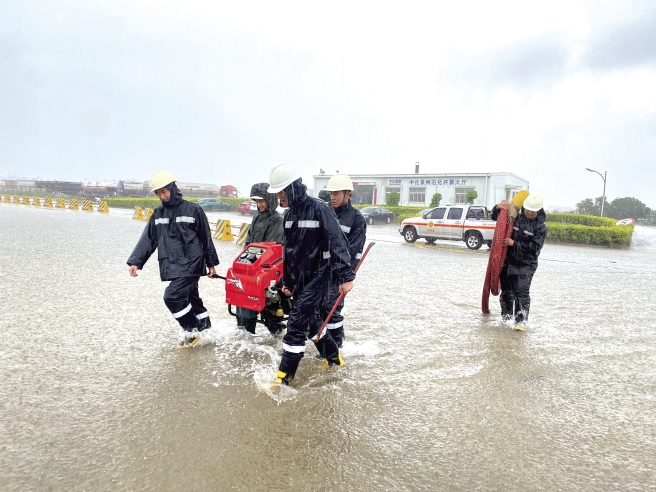 今年第5號臺風“杜蘇芮”于7月28日9時55分從福建省泉州市晉江沿海登陸,成為今年以來登陸我國的最強臺風。公司認真落實全國安全生產電視電話會議等要求,高度重視災害風險防范,組織旗下企業認真做好防臺防災和安全生產工作,并積極配合地方政府做好搶險救災準備。位于福建、廣東、安徽、浙江、江蘇、山東、河北、天津、河南、北京等地的企業積極應對,全面落實落細防臺舉措,最大限度減少臺風造成的破壞和影響,保障員工安全與企業生產平穩。地處臺風登陸地的泉州石化,安排生產管理團隊、操作人員和維保隊伍全部駐守廠區,全力保障裝置連續安穩運行。圖為泉州石化消防隊正在搶救汽車裝運的交通道路“生命線”。