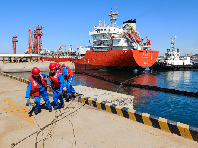 近日,我國多地氣溫下降,部分地區氣溫驟降10攝氏度左右,為冬季能源保供帶來挑戰。中化能源物流所屬各庫區碼頭積極應對區域能源需求增長態勢,持續加強生產管理,科學安排碼頭調度,確保靠泊油輪順利完成轉輸工作,保障能源輸送不間斷。圖為蓬萊油港碼頭操作工正在協助船舶靠岸。
